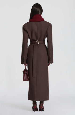 The Ursula Coat in Plum Brown features a full-length tailored silhouette crafted from a wool blend. It boasts a notched collar with wide lapels, a button-down front, and an adjustable back waist strap for a refined, cinched fit. Angled welt pockets add subtle elegance to this sophisticated wardrobe staple.