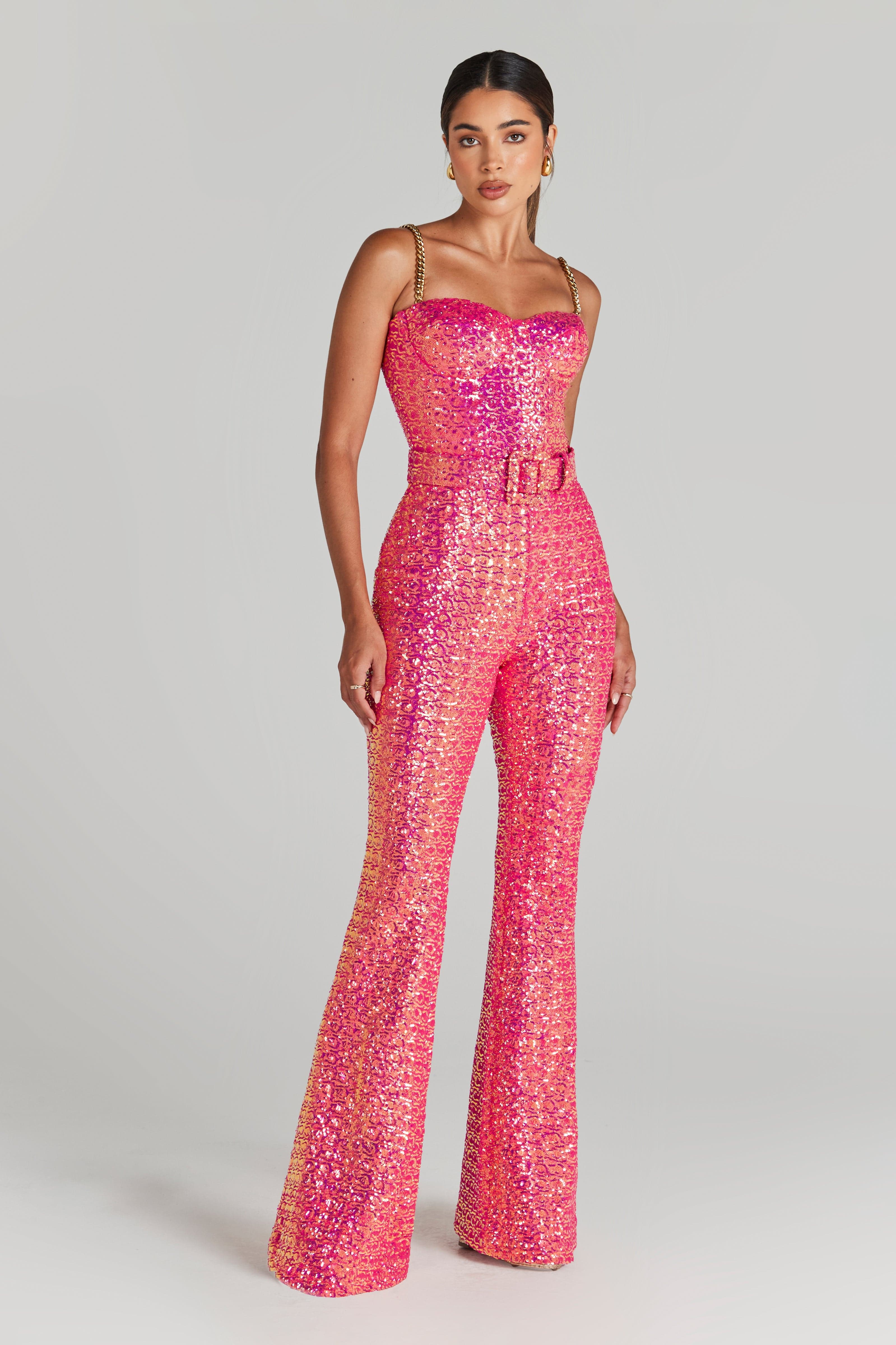 Step into glamour with the LUCINDA White Jumpsuit, the ultimate bridal statement piece expertly designed to turn heads on your special day. Crafted from our exclusive pearl-white shimmer sequin, this white belted jumpsuit hugs the body perfectly, paired with flared pants. The underwire bustier gives structure to complement your shape and a cinched silhouette. With removable diamanté straps and a detachable embellished belt, this versatile jumpsuit can be styled to your preference for a personalized bridal look.
