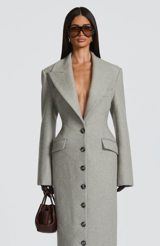 The Ursula Coat in light grey combines a refined wool blend with a full-length tailored silhouette. Featuring a notched collar with wide lapels, multi-button closure, and adjustable back waist strap, it offers an elegantly fitted shape. Angled welt pockets add subtle detail, perfect for a sophisticated, polished look.