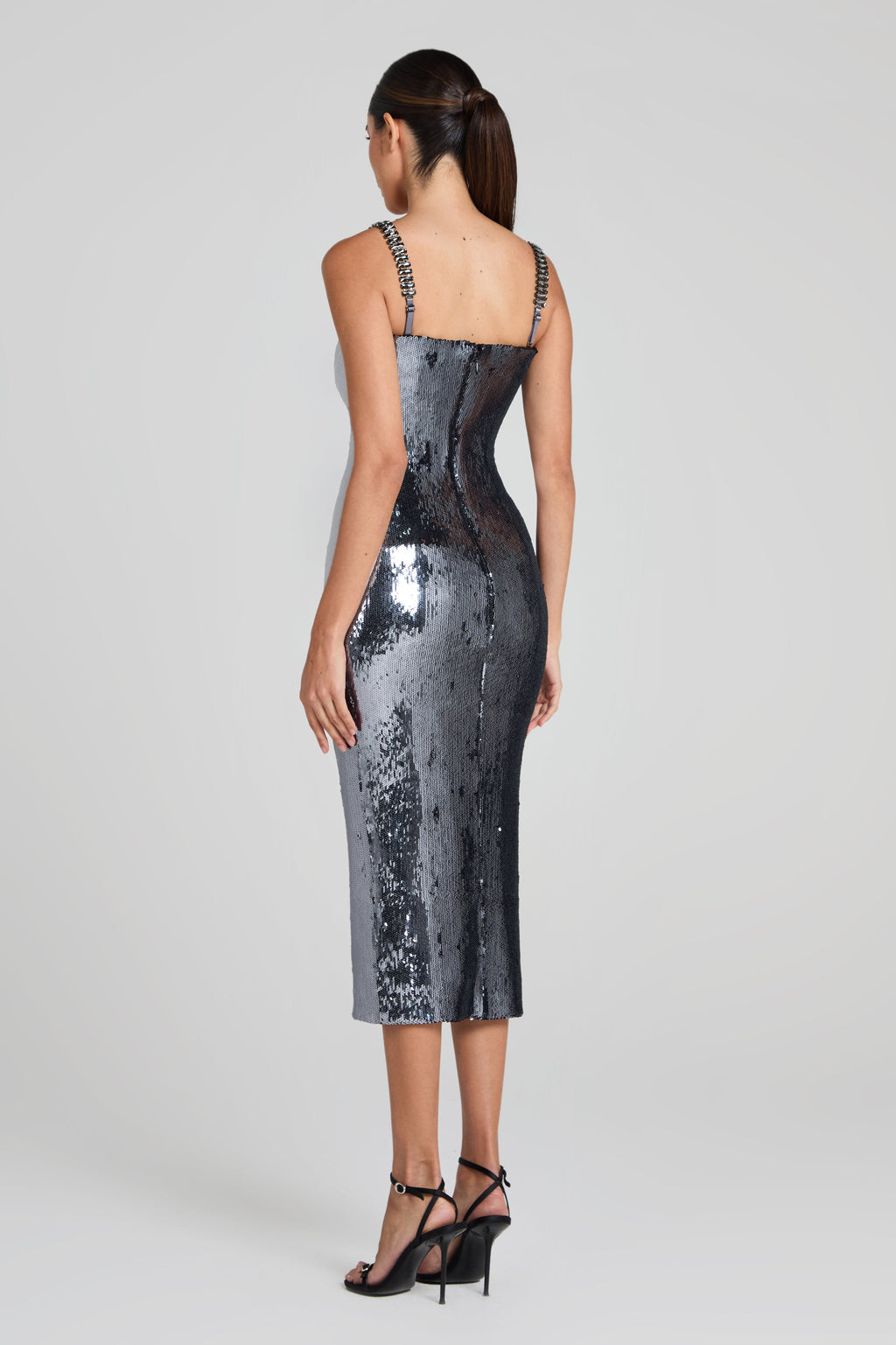 BROOKE is a bodycon midi dress with a corset style bodice. Crafted from high-shine liquid silver sequin, this figure-hugging silhouette features internal boning to the front, back, and sides for a contouring fit. Finished with jewel- embellished detachable straps, satin lined cups, and a concealed zip to the centre back. Fully lined for a smooth fit.