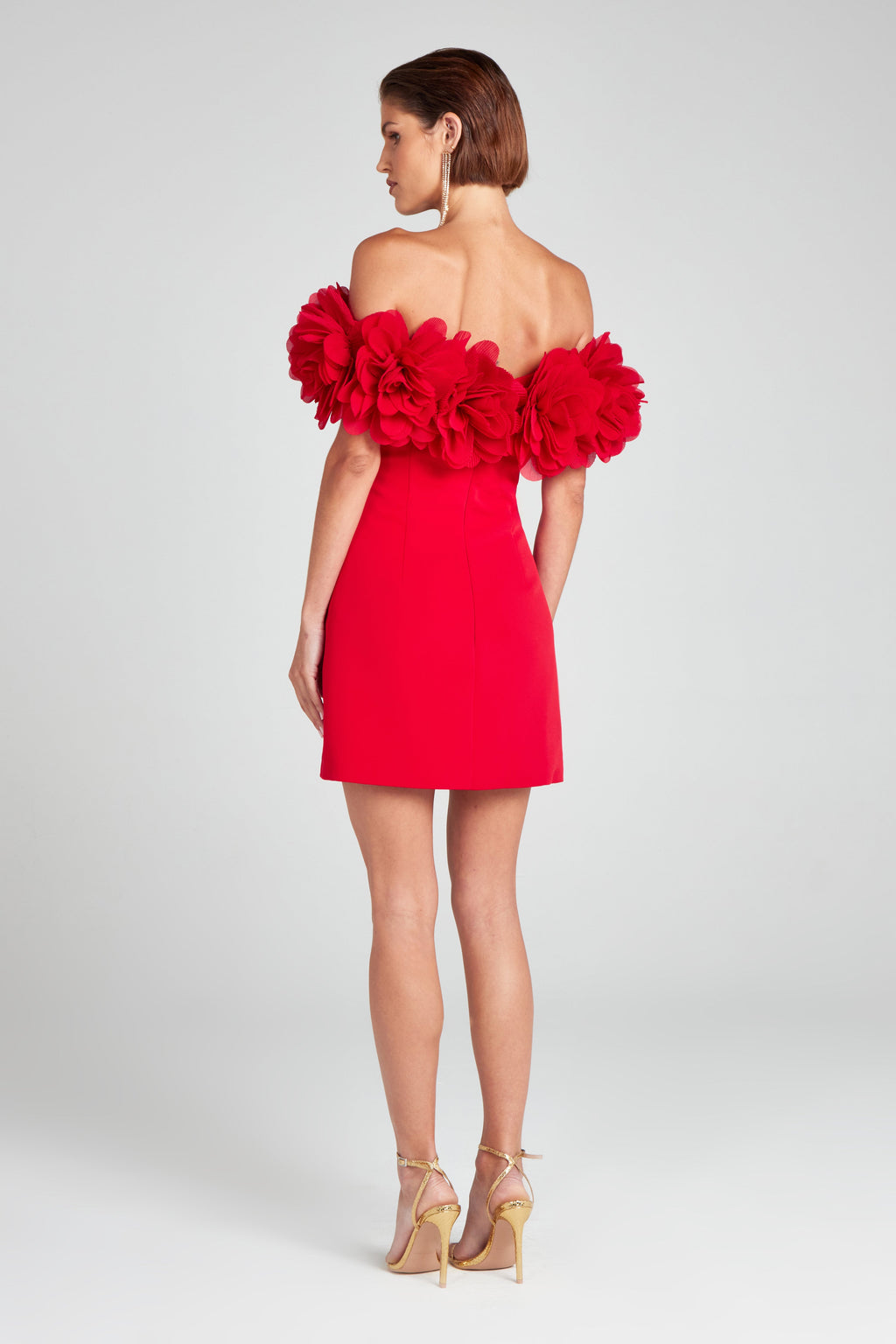 RENEE Red is a stand-out bodycon mini, crafted from our exclusive crepe fabric. She boasts a statement off the shoulder neckline detailed with 3D pleated chiffon floral appliqués all the way around to the back, creating bold volume and texture. This dress is designed with contour panel detailing finished with a cut out split to the front hemline. There is boning to the front back and sides to accentuate your silhouette, finished with a zip down the centre back. Fully lined for a smooth fit.